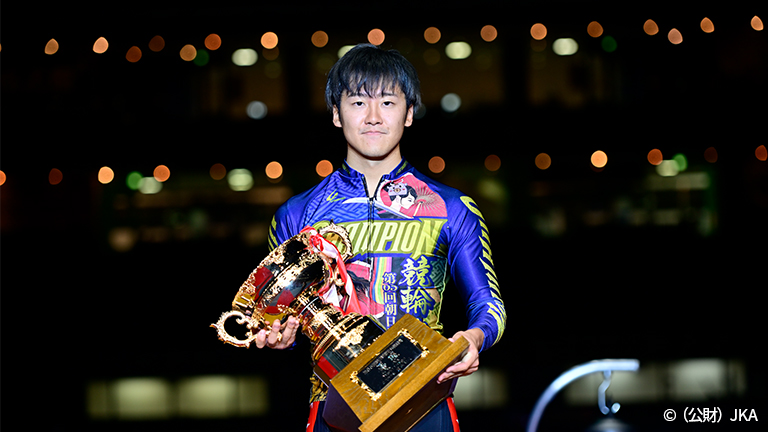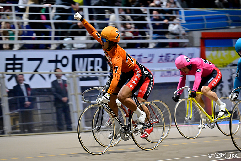 「本当に自分でもビックリなんですけど。単騎も好きなので、単騎で優勝できてうれしいです。ダイヤモンドレースは(単騎で)ダメダメだったんですけど、あそこで経験デキて良かったです。前に深谷さんと松井さんでああいう先行の仕方をやっていたなって思い出して、信じてついていきました。ジャンバックではこなくて、ホームでも見ながら。(最終バックの)直線で一車追い上げようと思っていたので理想通りの感じでした。(最後の直線は同期の松井との並んだが)そこも勝負でした。めちゃくちゃ嬉しかったです。(オールスター競輪以来で自身2度目のタイトルとなるが)あの時は緊張していたんですけど、今日は考えてもなるようにしかならないと思ったので、気楽に走ったら結果につながりました。自信を持って赤パンを履けるように。一年で(S班のレーサーパンツを)脱がなくてもいいように頑張ります」