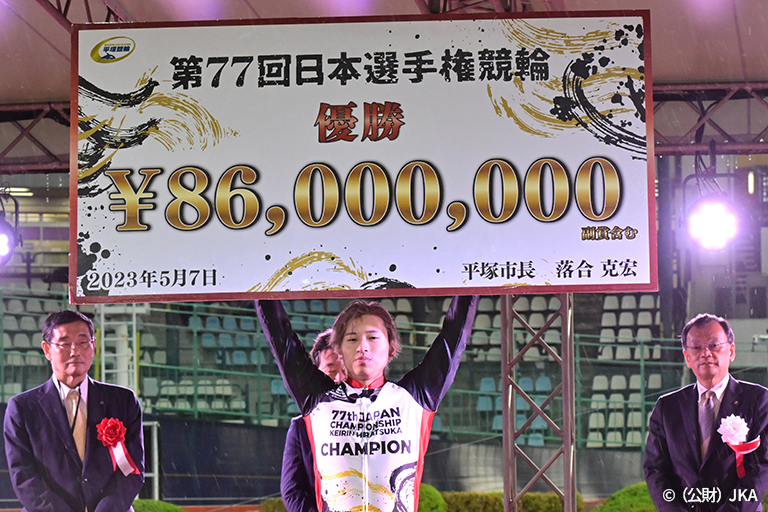 5月7日(日)に平塚競輪場で行われた第77回日本選手権競輪の決勝戦は単騎で臨んだ山口拳矢(岐阜・117期)が先手ラインに乗って最後の直線で外を強襲。犬伏湧也を目標に番手まくりを放った清水裕友をゴール寸前で追い込みゴール線を駆け抜けた。デビューから2年と11か月でのG1初タイトル。2021年9月の共同通信社杯以来となる2度目のビッグ制覇を達成した。